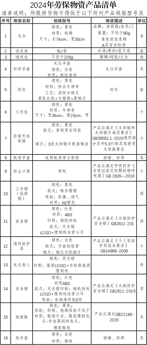 根據(jù)璧銅線運(yùn)營(yíng)公司工作開展需要,擬采購(gòu)公司2024年勞保用品,包含但不限于針織手套、線手套、帆布手套、防紫外線眼鏡、安全帽、反光背心、絕緣鞋、工作帽(檢修帽)、透明眼護(hù)具、雨衣、防塵口罩、毛巾、洗衣液、透明皂等日常運(yùn)營(yíng)勞保防護(hù)所必須配置物品,并完成驗(yàn)收工作。