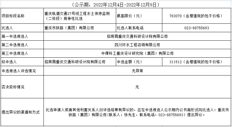 重慶軌道交通27號線工程水土保持監(jiān)測(二標(biāo)段)競爭性比選結(jié)果公示表