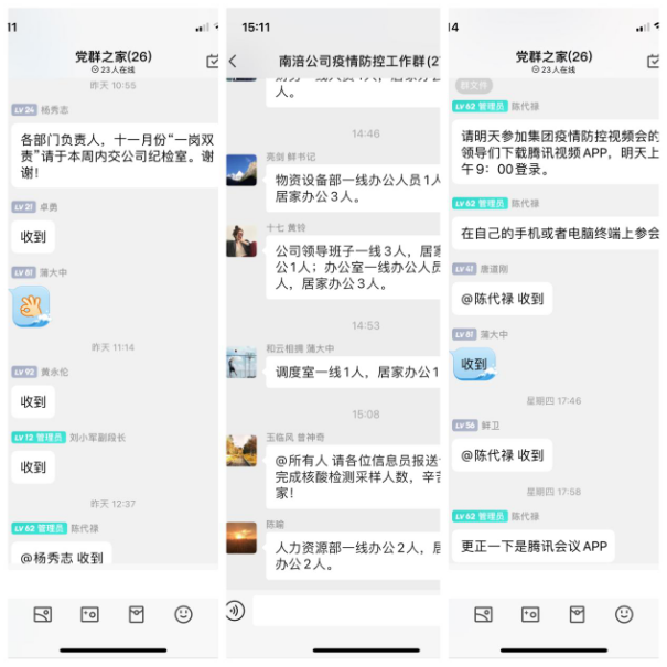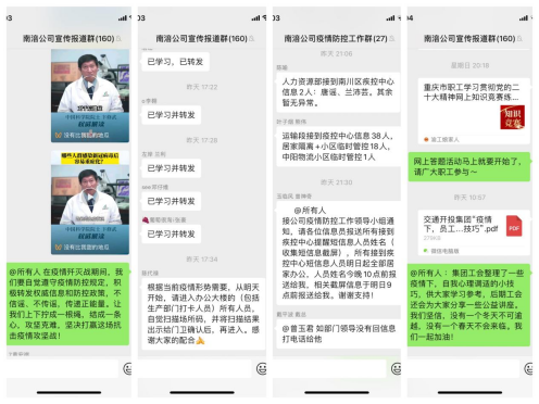 11月21日下午,臨近下班時間,南涪公司部分員工接連收到南川疾控中心短信提醒,提示因時空交集或暴露于涉疫場所,存在感染風險,要求當事人居家并配合三天三次核酸檢測。接到報告,公司疫情防控領導小組高度重視,立即部署,首先啟動信息收集工作,通過篩查,發(fā)現(xiàn)當日就新增居住小區(qū)臨時管控人員38人,短信提醒居家人員57人,超過公司員工總數(shù)的40%,已嚴重影響公司正常運行。守陣地,居家辦公不松懈