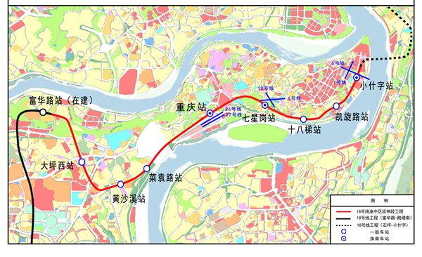 18號線北延伸段(富華路~小什字)全長11公里,投資100億元,設(shè)大坪西站、黃沙溪站、菜袁路站、重慶站、七星崗站、十八梯站、凱旋路站、小什字站共8座車站。18號線為重慶市軌道交通線網(wǎng)中的西南-東北向的骨干線路,強化了城市核心區(qū)的快速聯(lián)系。18號線北延伸段為中心城區(qū)加密線,與18號線相接,有效緩解化龍橋、大坪、菜園壩等片區(qū)交通擁堵,填補了渝中半島下半城的軌道空白。